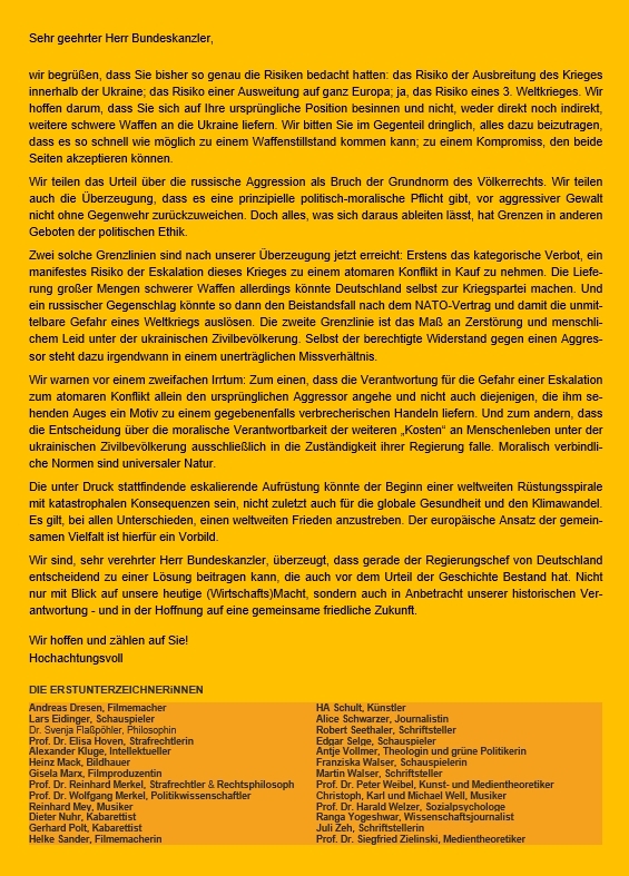 Ist das wirklich das Signal, das man hier senden möchte? In der Konsequenz wird mit an Sicherheit grenzender Wahrscheinlichkeit umgehend die nächste Aggression mit noch größerer Skrupellosigkeit vorbereitet werden. Die in diesem Brief vertretene Haltung mag mit Glück für den Moment zu einer Waffenruhe in der Ukraine führen, zur dauerhaften Sicherung des Weltfriedens ist sie allerdings genauso ungeeignet, wie etwa das 9-Euro-Ticket zur Bekämpfung der Inflation.